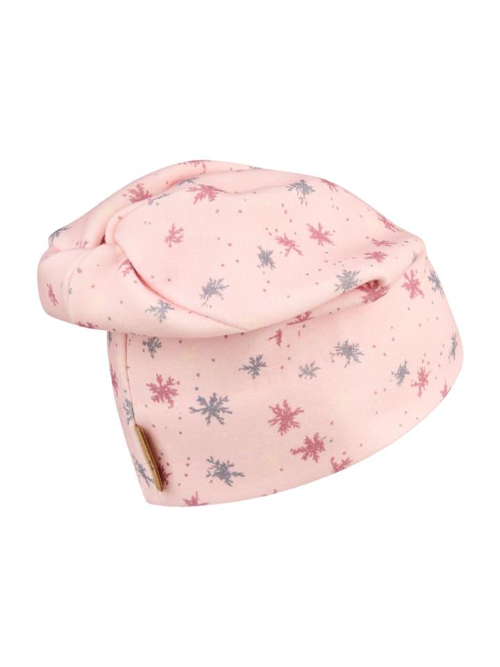 Шапочка из трикотажного полотна с пушистой спинкой, напечатанной снежными кристаллами.