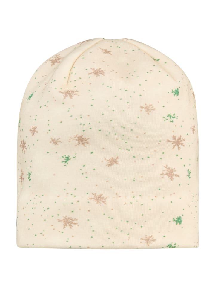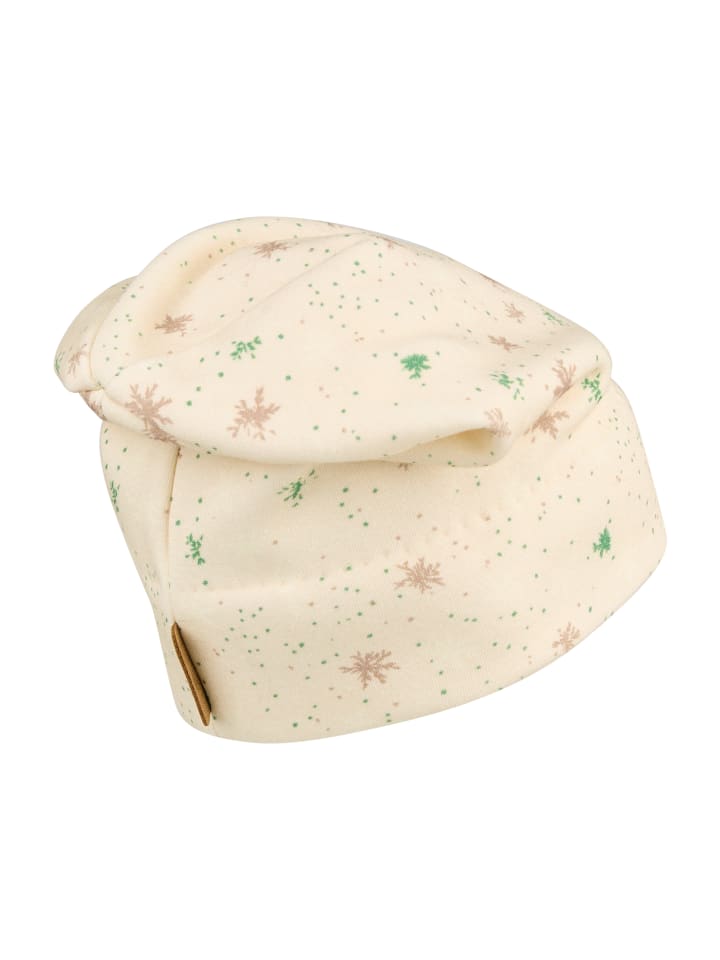 Шапочка из трикотажного полотна с пушистой спинкой, напечатанной снежными кристаллами.