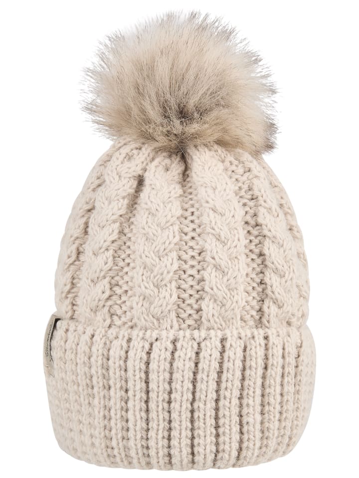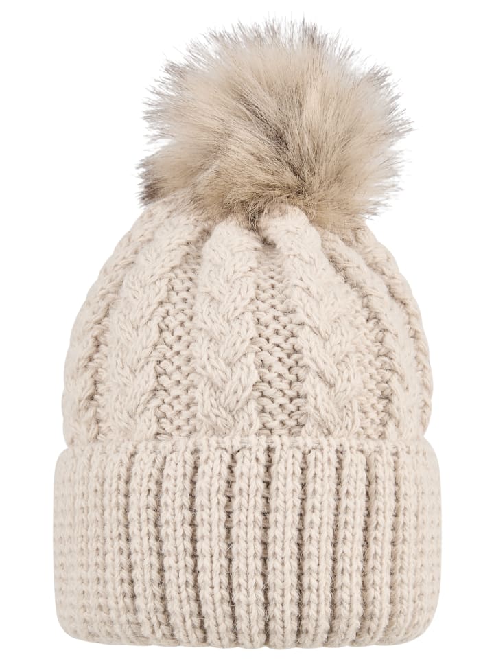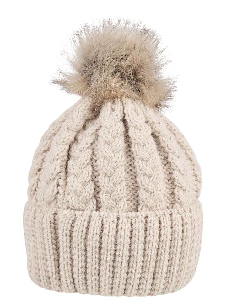 Вязаная шапка с манжетой /// с узором косы /// с помпоном из искусственного меха