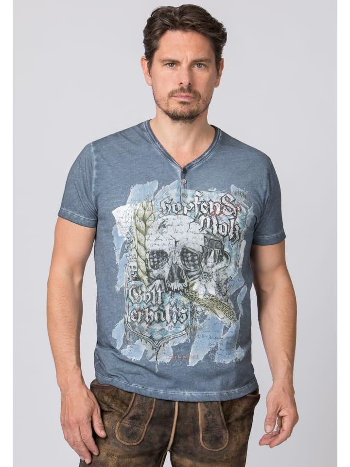 Футболка Mountain Rocker дымчато-синего цвета. Эта классическая рубашка удобного кроя из высококачественного хлопка впечатляет своим модным принтом со слоганом Хмель и солод, благослови Бог. Модный эффект потертости создает стильный образ и идеально подчеркивает стильный мотив дизайна. Искусно выполненный круглый вырез горловины еще больше подчеркивает уникальный образ. Рубашку можно носить с кожаными брюками и джинсами, и она станет незаменимым аксессуаром для крутых парней.
