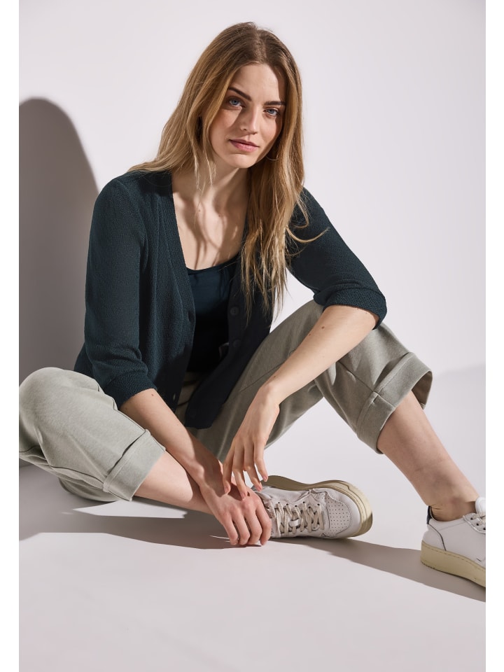 Куртка Street One трикотажного кроя, однотонная, короткая, V-образный вырез, застежка на пуговицы, рукава 3/4, комбинированный материал с добавлением эластичного материала. Форма воротника: V-образный вырез. Ширина груди: ок. 51 см для размера 38. Длина рукава: ок. 47 см для размера 38. Ширина низа: ок. 49,5 см для размера 38. Длина спереди: ок. 52 см для размера 38. Рост модели: 178 см, на ней размер 36. Внешний материал: 76% текстиль, 19% вискоза, 5% эластан.