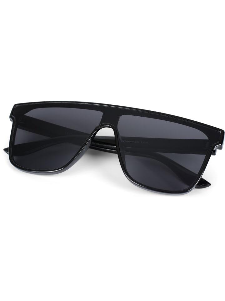 - Прямоугольные солнцезащитные очки с пластиковой оправой во всю оправу и поликарбонатным моностеклом.