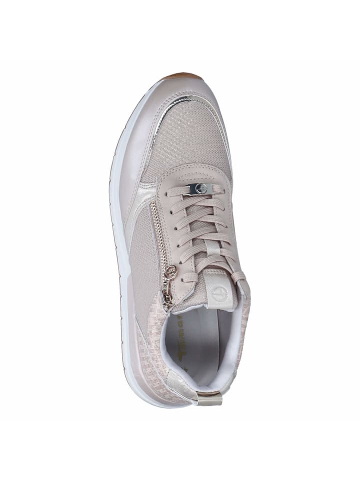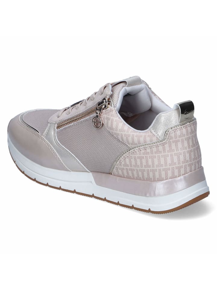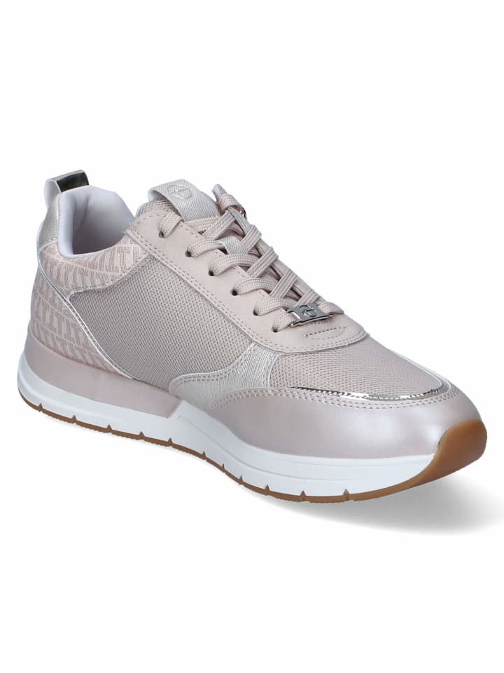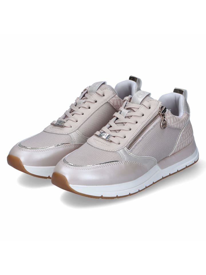 Розовые женские низкие кроссовки Tamaris из смеси текстиля и синтетических материалов не только стильные, но и веганские. Спортивный дизайн дополнен мерцающими металлическими элементами медного оттенка. Кроссовки оснащены шнуровкой и молнией для легкого надевания и снимания, а также двумя язычками для дополнительного комфорта.