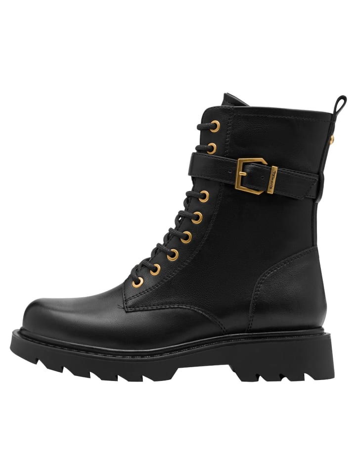 Ощутите полную свободу с каждым шагом в этих черных ботинках на шнуровке от Tamaris. Прочный дизайн с пряжками, шнуровкой и структурированной платформой сделает вас настоящей иконой уличного стиля для повседневной носки и приключений. Подошва толщиной 43 мм обеспечивает комфорт и уверенный внешний вид. Мягкая стелька Touchit с эффектом памяти идеально адаптируется к форме вашей стопы - идеально подходит для прогулок или городских исследований.