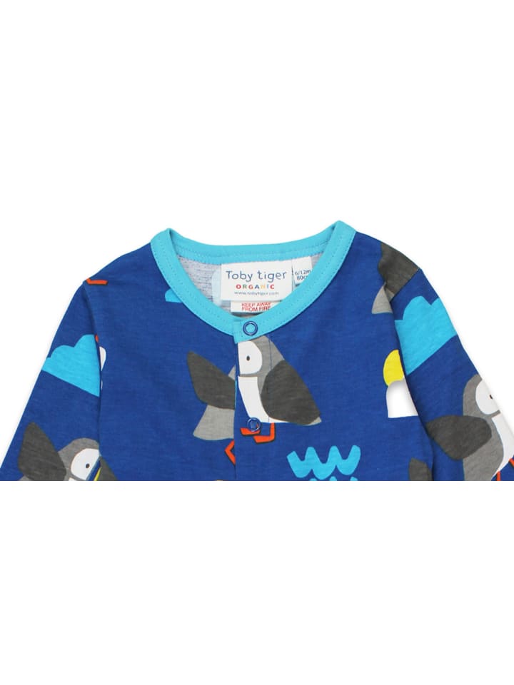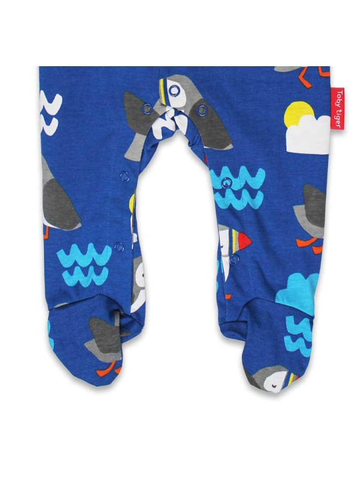 В этой органической пижаме ваши малыши будут выглядеть очаровательно, как тупики! Эти удобные пижамы с уникальным рисунком тигренка Тоби с солнцем, облаками и волнами на синем фоне идеально подойдут для вашего маленького искателя приключений. А благодаря широкому вырезу и кнопкам на штанинах одеться будет проще простого! Вперед, в страну снов!