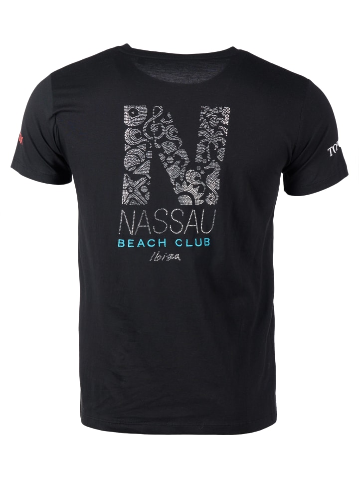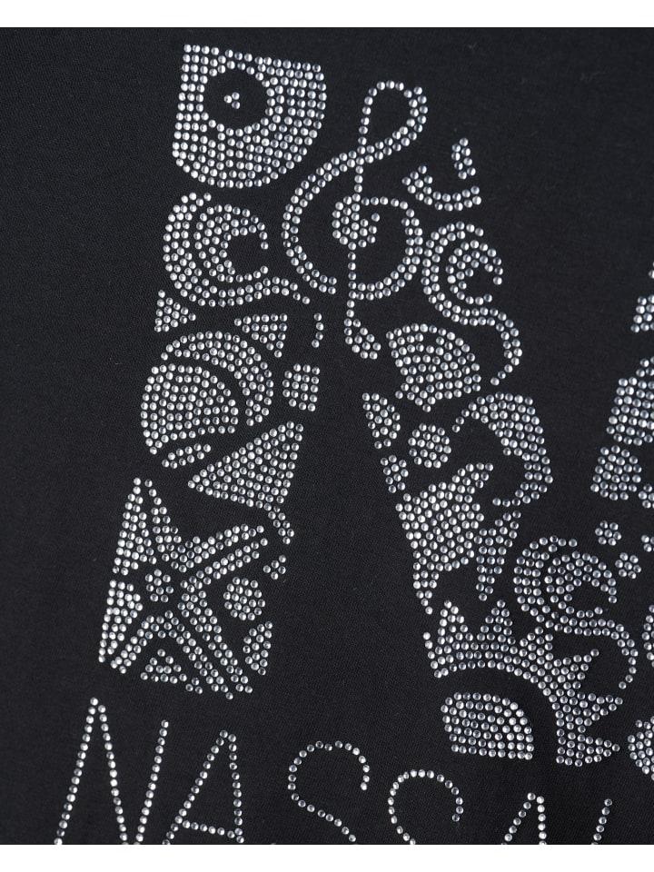 Топ украшен красивой надписью на груди и спине и украшен стильными стразами.