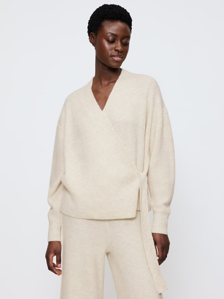 Этот кардиган с запахом идеально подходит для создания многослойного образа или как самостоятельный предмет одежды. Свободный крой, спущенные плечи и ребристые манжеты создают современный образ, а пришитый пояс практичен и универсален.