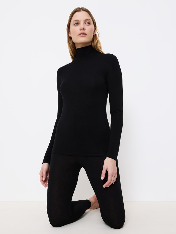 Эта водолазка с длинными рукавами - универсальная вещь, которую можно носить как отдельно, так и в составе многослойной одежды. Скрученные боковые швы повторяют изгибы тела, обеспечивая идеальную посадку. Она изготовлена из 48% мягкой шерсти и модала. Она легкая, эластичная, теплая и приятная на ощупь - идеально подходит для самых разных случаев.