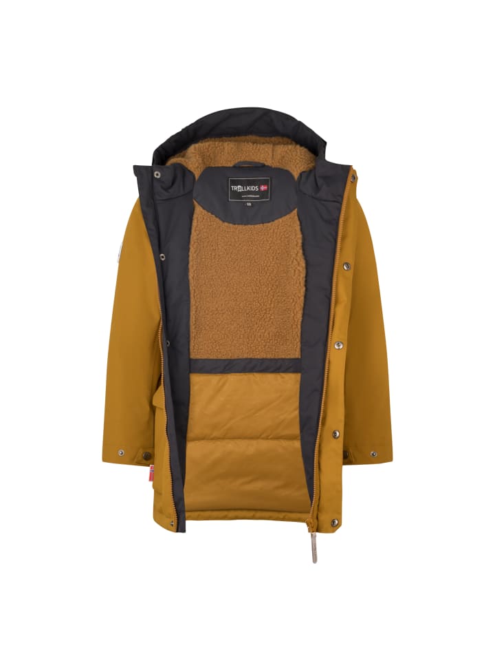 Эта чуть удлиненная, водонепроницаемая и очень прочная парка KIDS GUDVANGEN JACKET в скандинавском стиле обладает всеми преимуществами: внутренняя подкладка из плюшевого флиса (шерпа 350 г/м²) в сочетании с утеплителем обеспечивает надежное тепло. Трикотажные манжеты не пропускают холодный воздух, а прочный регулируемый капюшон также обеспечивает исключительное тепло благодаря подкладке из плюшевого флиса. Три кармана с клапанами - один на груди и два по бокам на уровне бедер - на кнопках надежно хранят все необходимое. Также имеется потайной нагрудный карман на молнии. Маленький логотип TROLLKIDS на груди и сдержанный двухцветный дизайн подчеркивают почти классический стиль этой вневременной и практичной куртки.