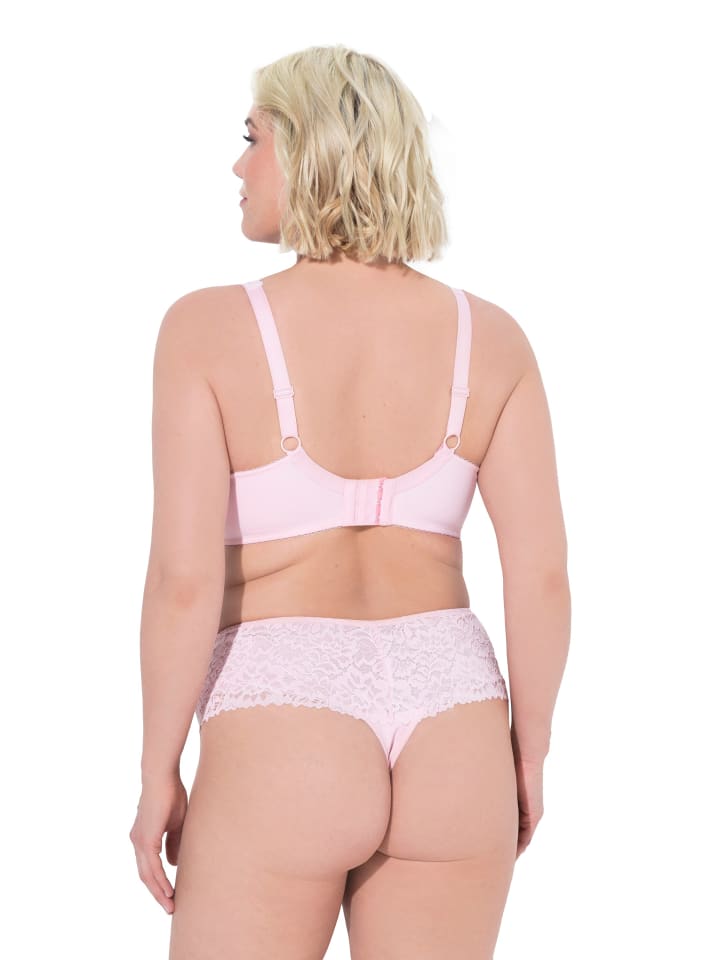 Бюстгальтер на косточках, с мягкой чашкой, высоким лифом, с тонким блестящим кружевом на мягкой чашке и регулируемыми бретелями. Женственные фестончатые края.