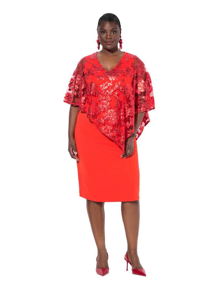 Платье с пайетками, элегантный многослойный фасон, с V-образным вырезом. Прозрачный пайеточный верх с рукавами длиной 3/4, напоминающими накидку. Асимметричный подол.