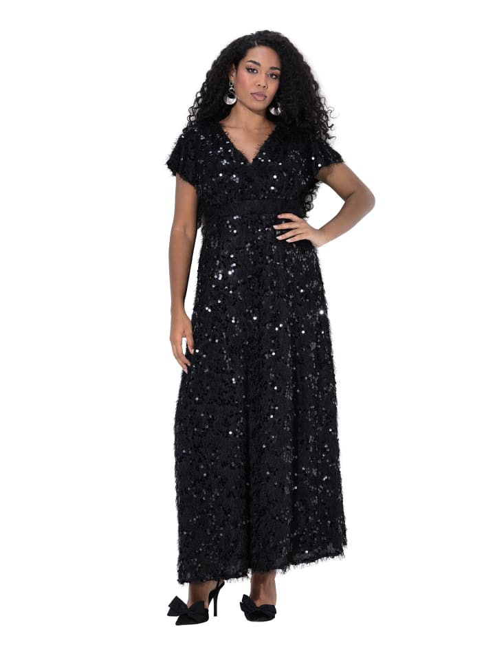 Вечернее платье А-силуэта с очень тонкой длинной бахромой и пайетками по всей длине. Комбинация из плотного трикотажа. V-образный вырез с эффектом запаха, застежка-молния сзади. Пояс на талии. Аккуратно пришитые рукава с разрезами сверху. Внешний материал: 100% полиэстер. Подкладка: 95% полиэстер, 5% эластан.