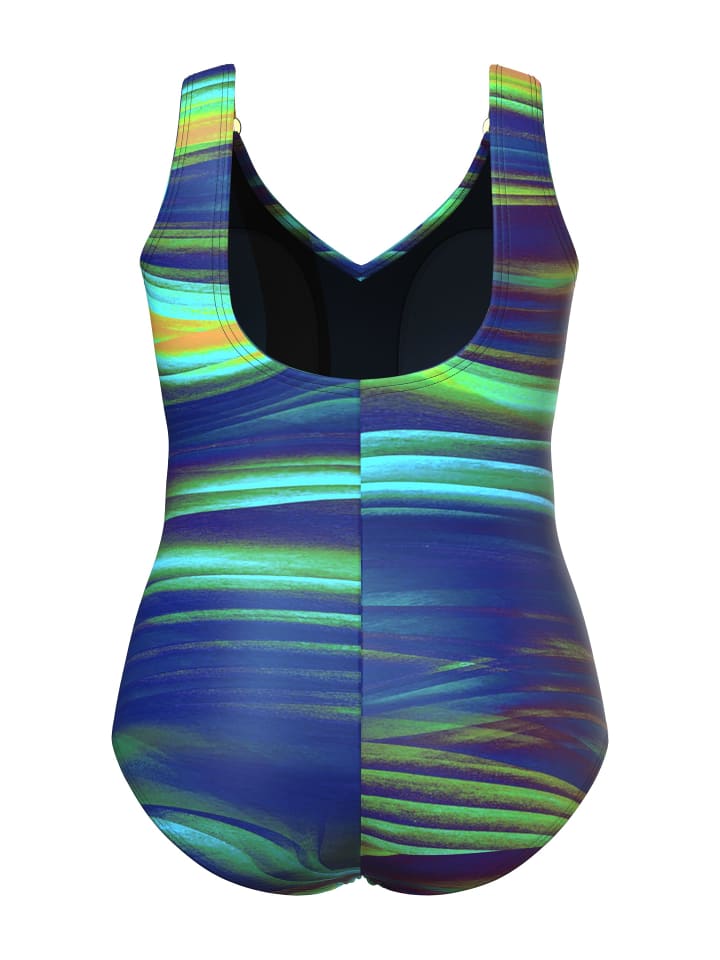 Купальник с мягкими чашечками и спортивным рисунком. Женственная сборка на груди, бретели с декоративными кольцами. Утягивающая лента под грудью, подкладка спереди. Изготовлен из переработанного полиамида. OEKO-TEX.
