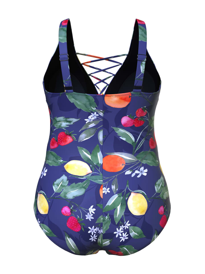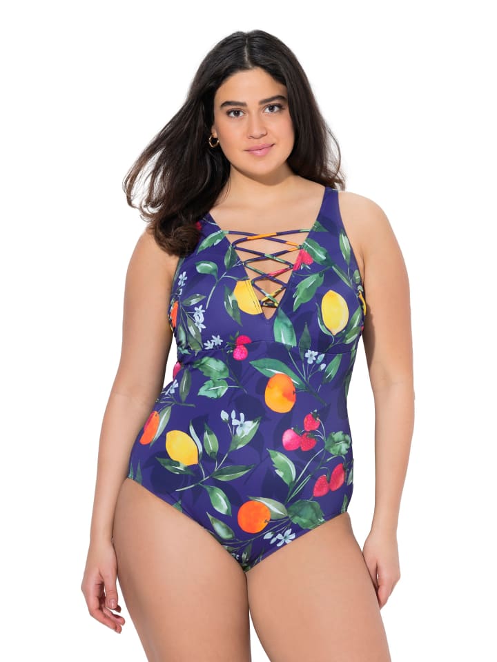 Купальник с мягкими чашечками и фруктовым узором. V-образный вырез с декоративной шнуровкой. Резинка под грудью, подкладка спереди. Изготовлен из переработанного полиамида. OEKO-TEX.