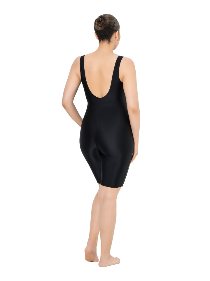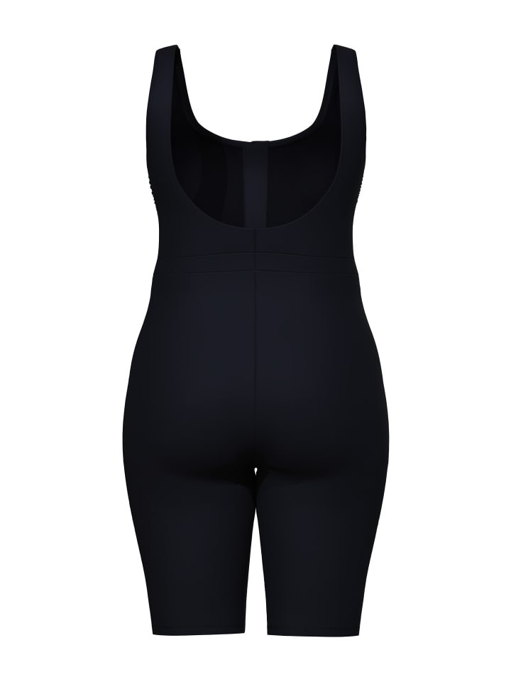 Купальник без мягких чашек, с длинными штанинами. Круглый вырез на молнии, сборка по бокам, пояс под грудью, подкладка спереди.