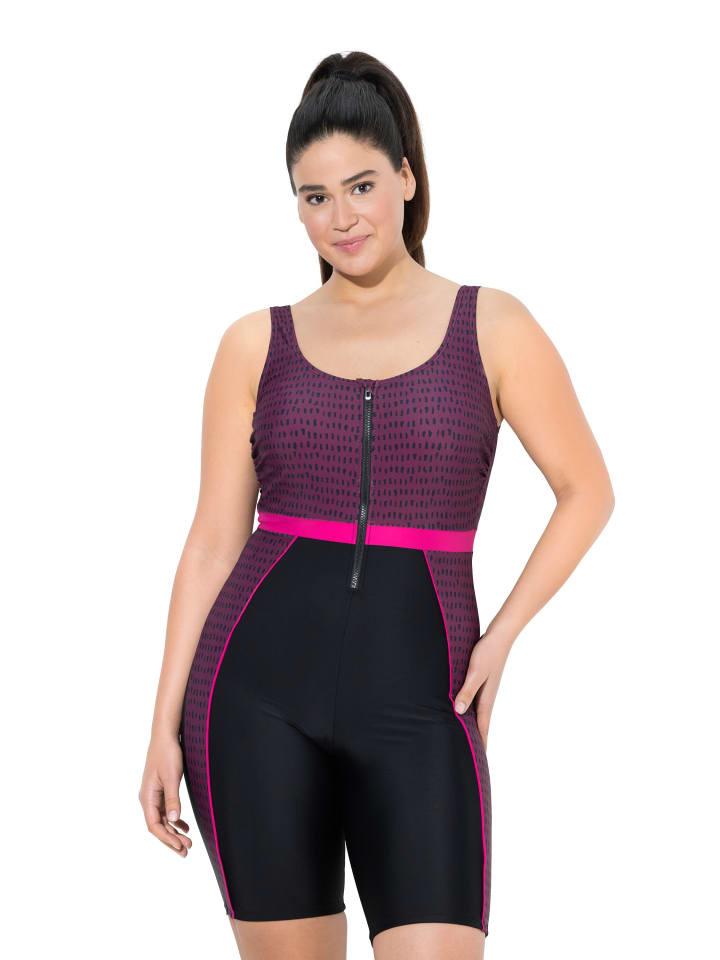 Купальник без мягких чашек, с удлиненными штанинами. Точечные вставки на груди и боках. Круглый вырез горловины с длинной молнией. Цветная поперечная резинка, поддерживающая резинка под грудью, подкладка спереди. Изготовлен из переработанного полиамида. OEKO-TEX.