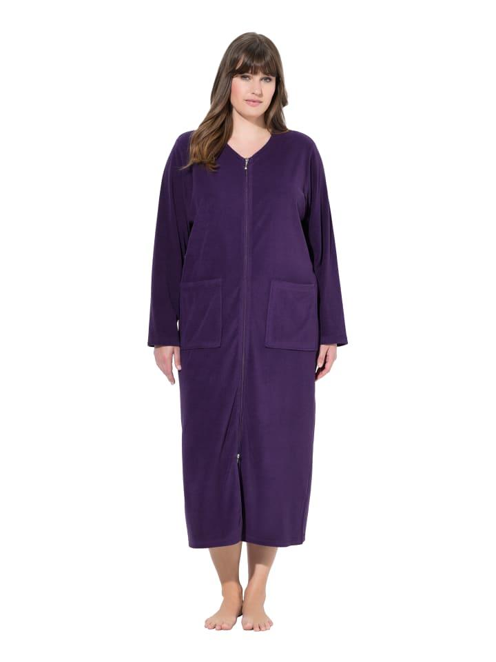 Мягкий махровый халат. С V-образным вырезом, двухсторонней молнией, двумя карманами и длинными рукавами.
