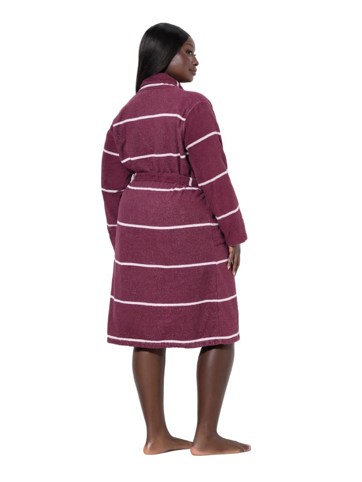 Махровый халат, мягкий, приятный на ощупь, с полосками. Удобный крой, воротник-шалка и пояс на талии. Два боковых кармана, длинные рукава. OEKO-TEX. Внешний материал: 100% хлопок.