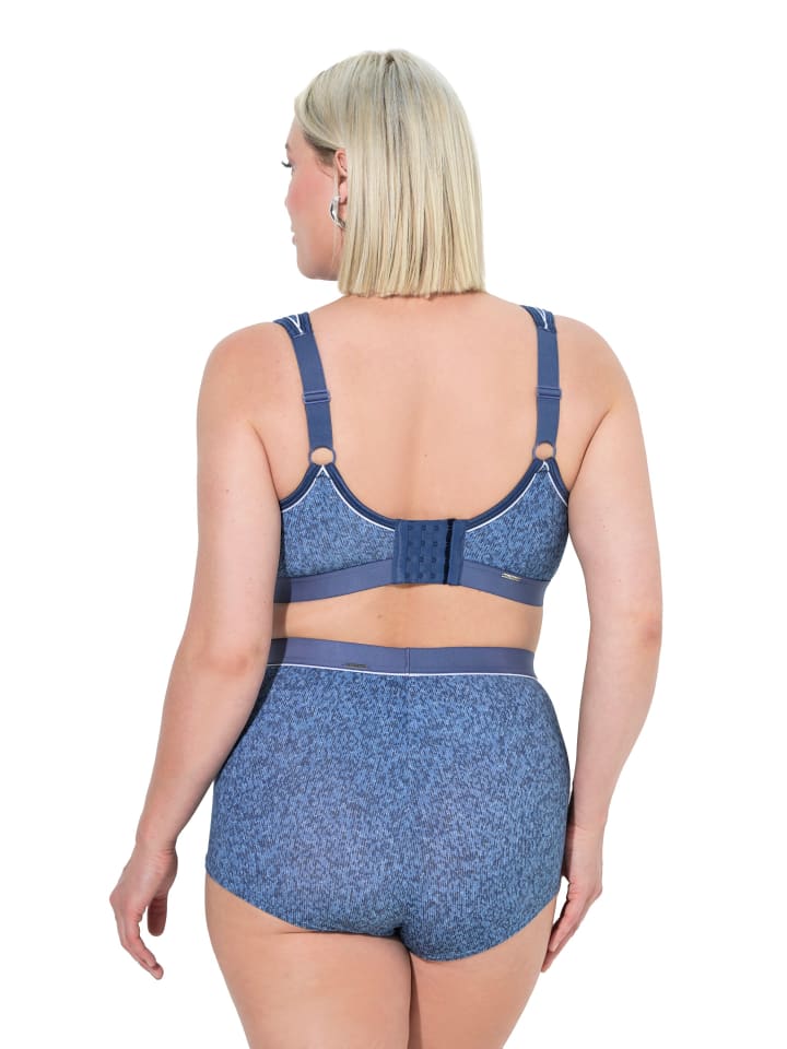 Минимайзер без косточек. Джинсовый фасон, отделка из мерцающего атласа, широкие регулируемые бретели.