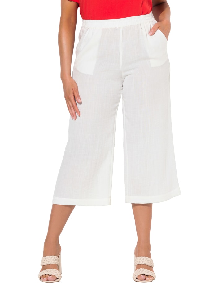 Кюлоты длиной примерно до икры, широкие, прямые. Эластичный пояс, боковые карманы.