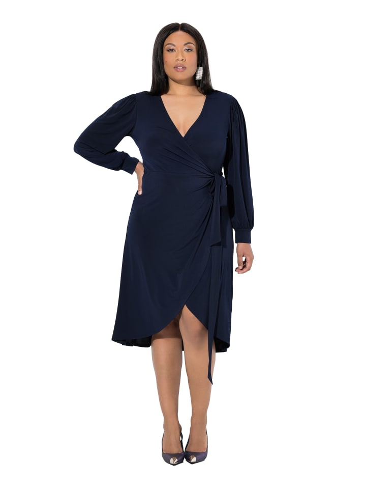 Платье-халат миди с завязками - всегда удобное благодаря приятной эластичной ткани. V-образный вырез, длинный пояс, удлиненный подол сзади. Широкие рукава-фонарики с эластичными манжетами.