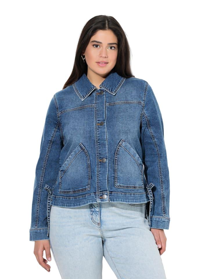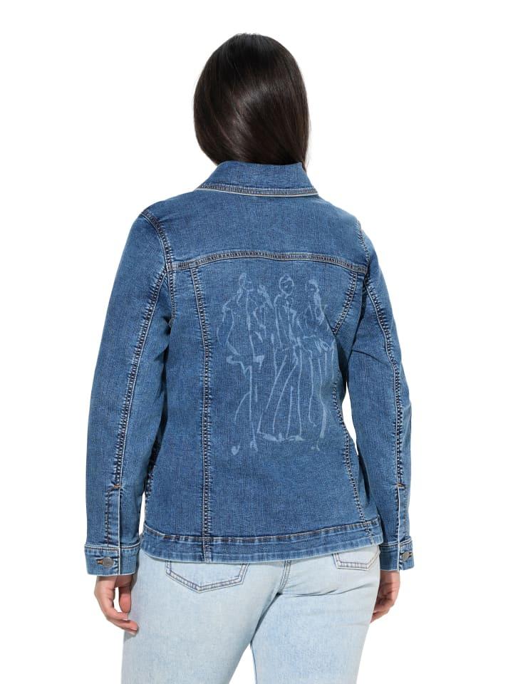 Свободная джинсовая куртка свободного кроя из переработанного полиэстера. Верх: крупный принт на спине. Отложной воротник, планка на пуговицах, два накладных кармана. Низ, примерно на 8 см длиннее сзади, с завязками по бокам.