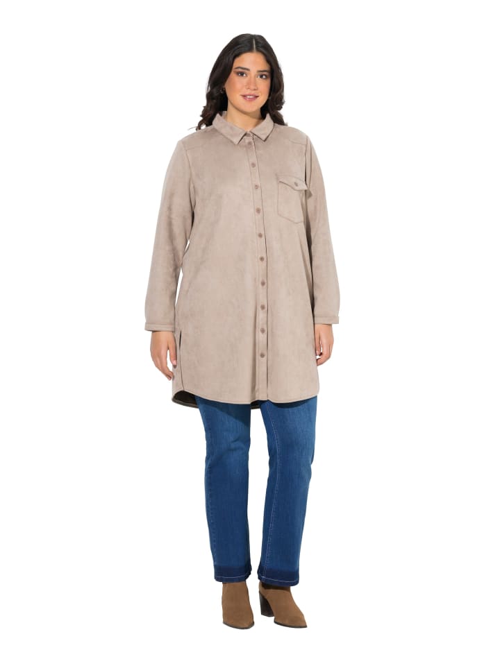 Длинная замшевая куртка А-силуэта из мягкой искусственной замши. Отложной воротник, планка на пуговицах, нагрудный карман. Длинные рукава с манжетами. Закругленный низ с длинными боковыми разрезами для большего комфорта.
