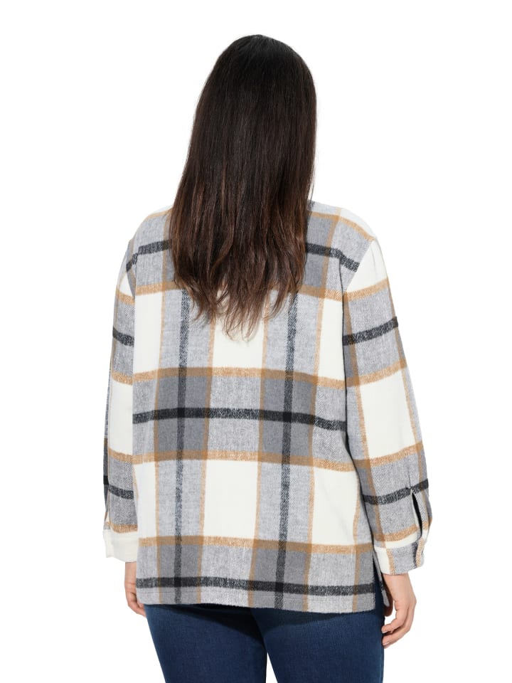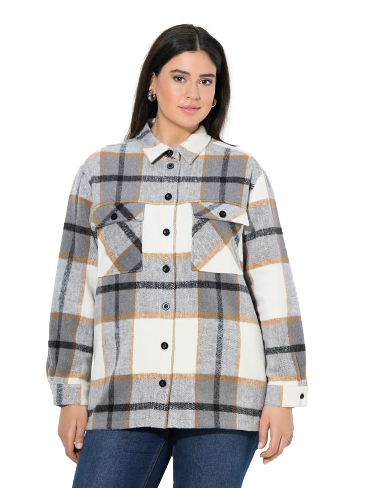 Клетчатая куртка свободного кроя, рубашка-рубашка. Отложной воротник, спущенная линия плеча и планка на пуговицах. Длинные рукава с манжетами и закругленными боковыми разрезами для еще большего комфорта.