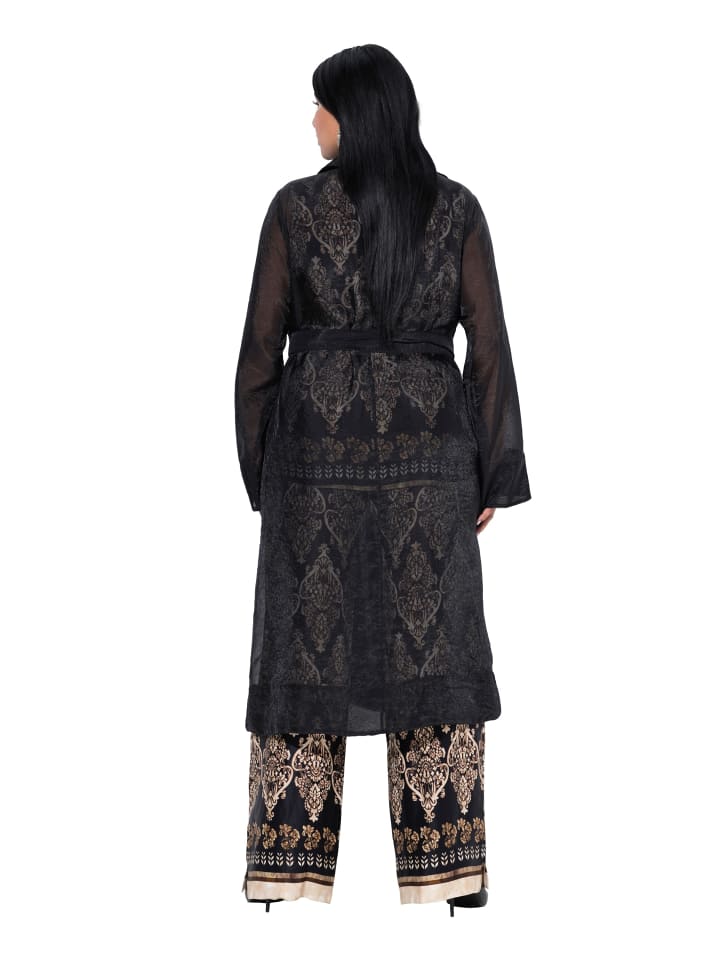 Расклешенное пальто А-силуэта из тонкой органзы с поясом на талии - силуэт вашей мечты. Воротник с лацканами, застежка на пуговицы, широкие длинные рукава и струящийся подол.