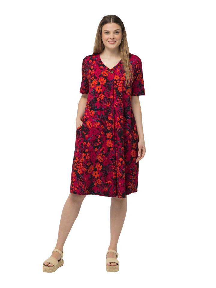 Платье миди из джерси, А-силуэта, с принтом по всей поверхности, V-образным вырезом на пуговице и декоративной складкой, короткими рукавами. Карманы в боковых швах.