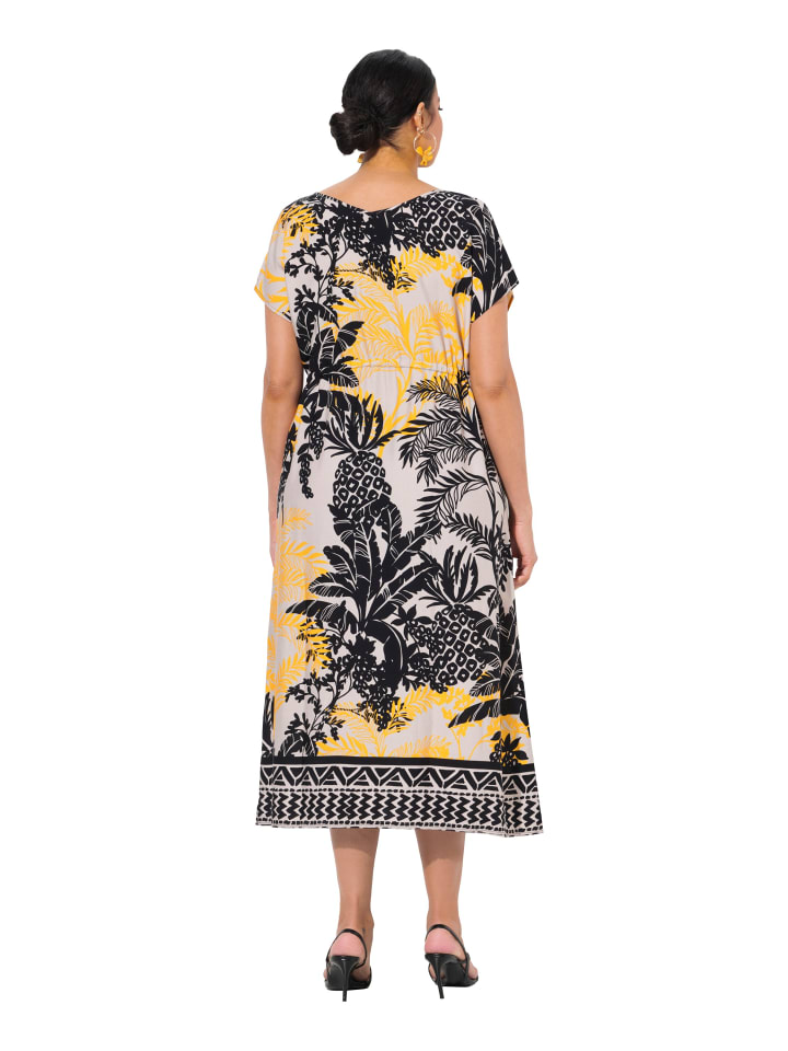 Платье макси, удобного кроя, из мягкой драпирующейся вискозы с цветным рисунком в виде пальм и каймой по низу. V-образный вырез, спущенные плечи, кулиска на талии - всегда ваш желаемый силуэт.