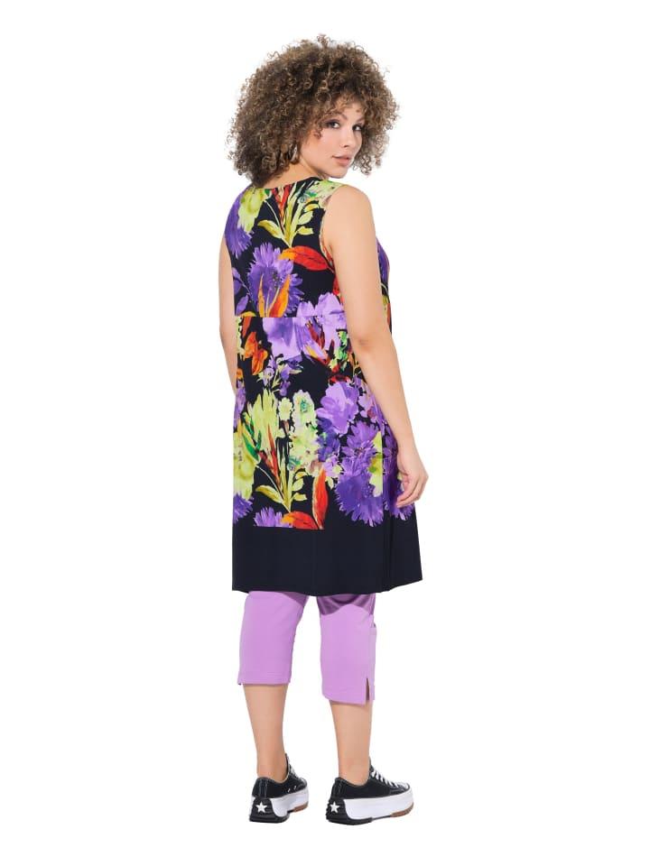 Платье трикотажное, без рукавов, А-силуэта, из комфортного эластичного трикотажа с модным принтом и каймой по подолу. Круглый вырез горловины, 2 накладных кармана.