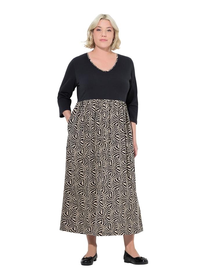 Платье из джерси, А-силуэта, с рисунком. Удобная посадка, V-образный вырез и эластичный шов в стиле ампир. Рукава 3/4, карманы в боковых швах. Внешний материал: 100% хлопок.