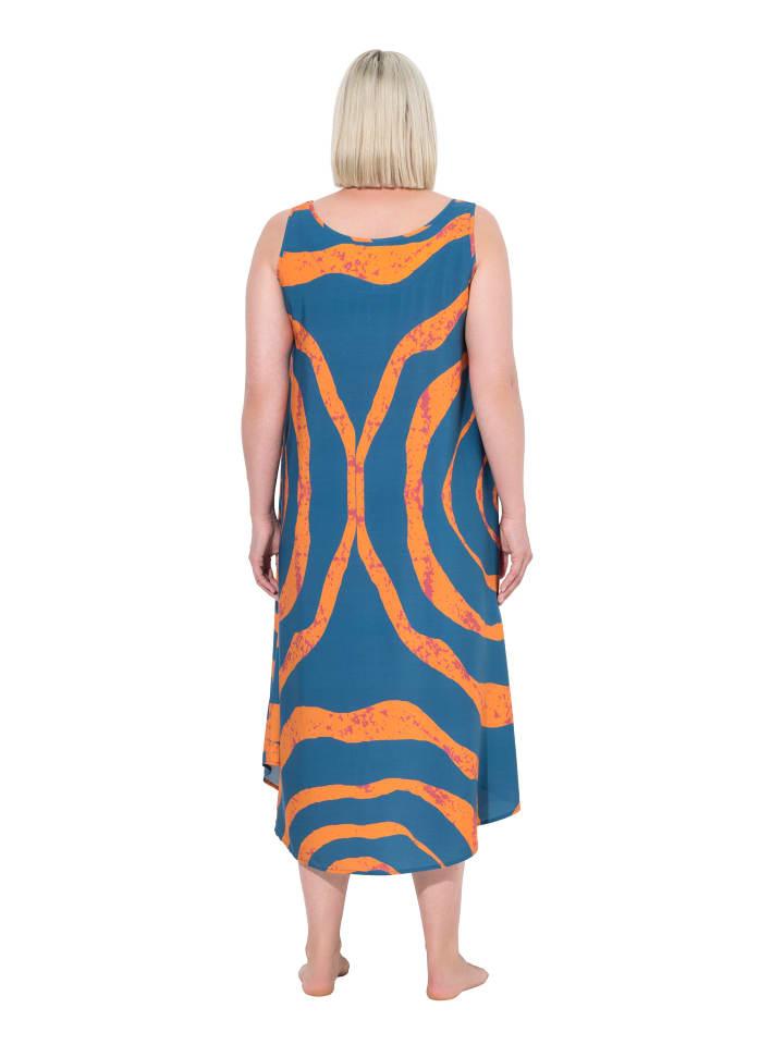 Платье миди без рукавов из мягкой, струящейся вискозы с круговым узором. Модель на бретелях, с круглым вырезом и широким подолом.