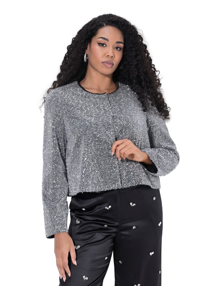 Жакет из букле, короткий, свободного кроя, с серебристым блестящим эффектом, пайетками и бисером. Круглый вырез, застежка на потайные кнопки. Широкие прямые длинные рукава, карманы в боковых швах. Мягкая трикотажная подкладка.