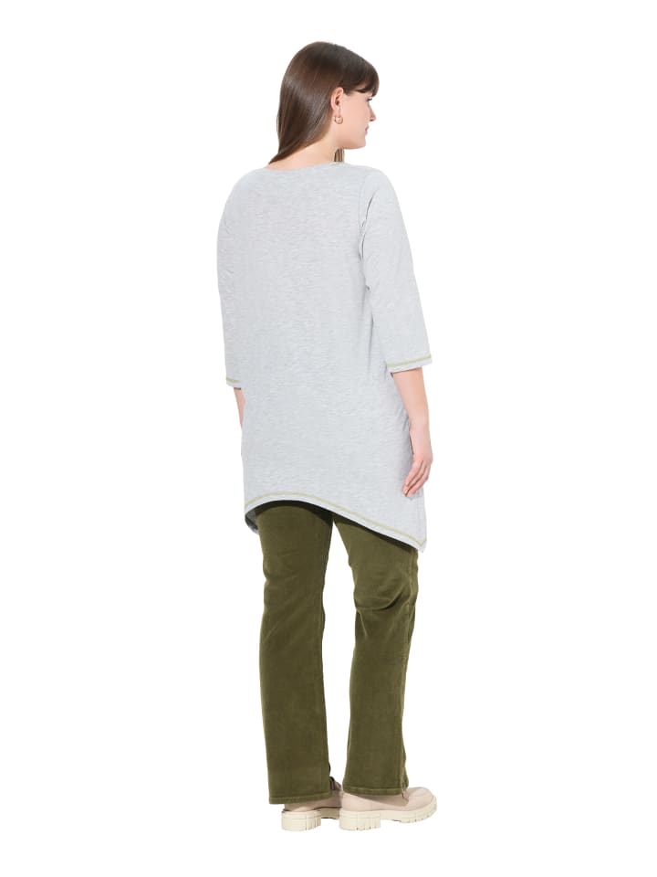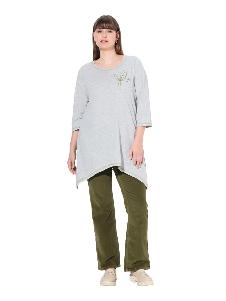 Футболка из органического хлопка, меланжевого трикотажа с вышивкой в виде мелких листьев и декоративными бусинами. Заостренный низ. Удлиненный А-образный силуэт с круглым вырезом и рукавами длиной 3/4. Органический; сертифицирован ECOCERT Greenlife, лицензия № 152026. Внешний материал: 95% хлопок, 5% вискоза.