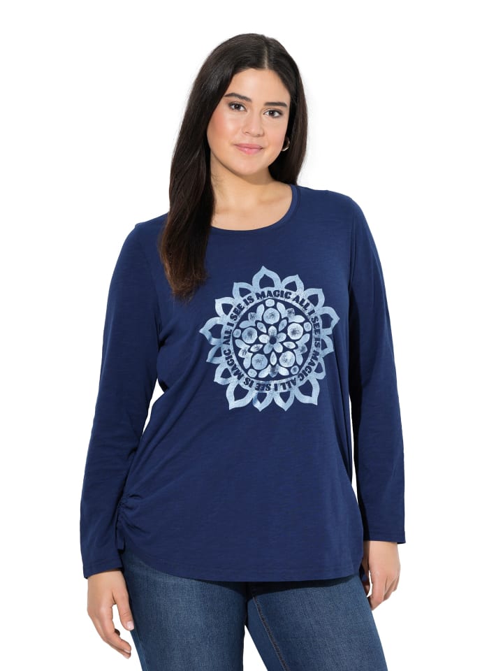 Рубашка классического кроя из мягкого трикотажа с мандалой. Слегка закругленный низ, сборка по бокам и завязка на талии - ваш идеальный силуэт. Круглый вырез, длинные рукава. Внешний материал: 100% хлопок.