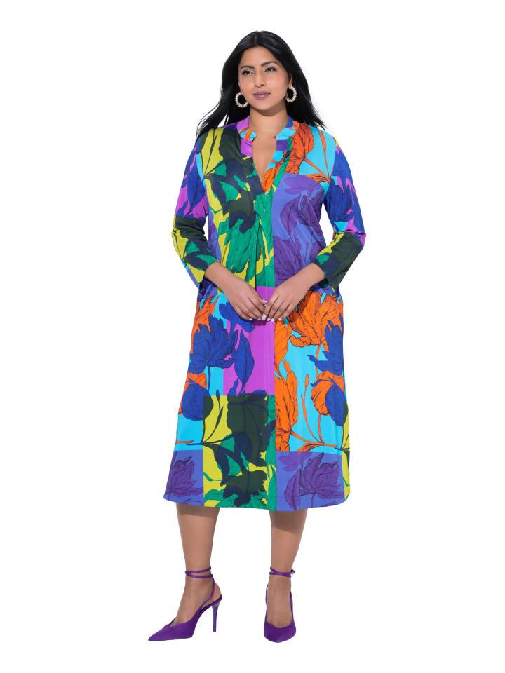 Облегающее платье миди, слегка расклешенного силуэта, выполнено из элегантной обтягивающей пике с тонкой текстурой и красочным рисунком в виде листьев. Воротник-стойка с V-образным вырезом и декоративной складкой, рукава длиной 3/4 с разрезом. Карманы в боковых швах. Низ с боковыми разрезами для большего комфорта.