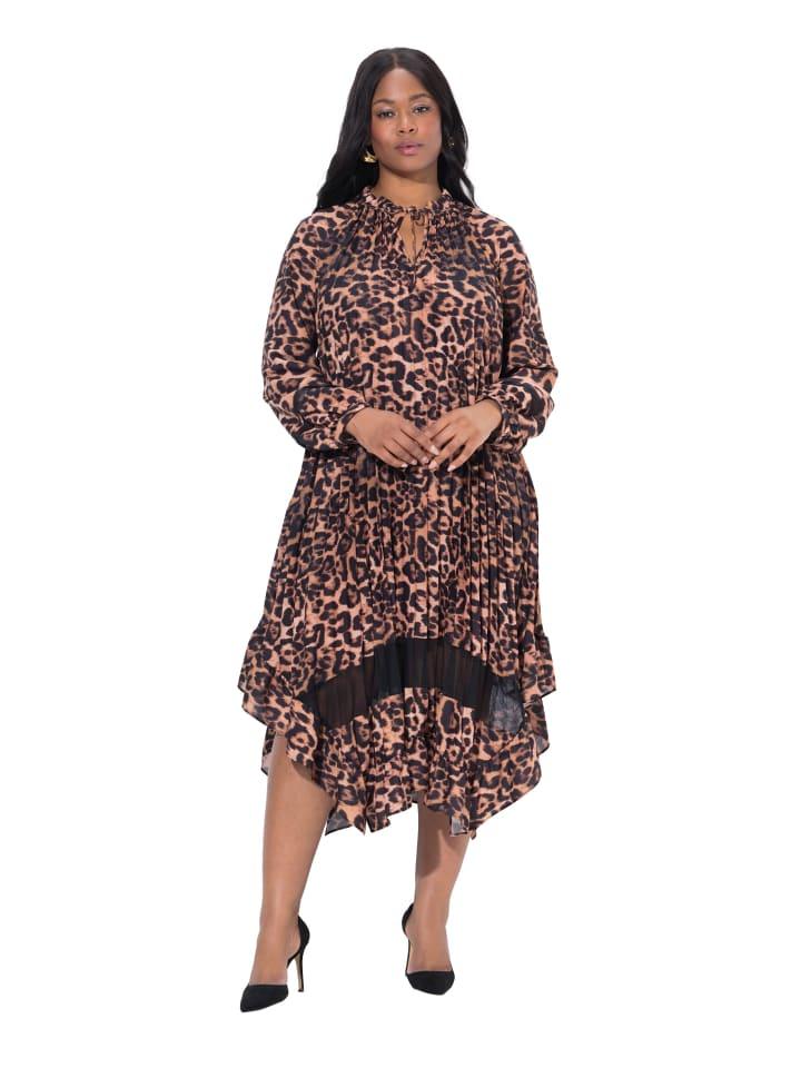 Платье А-силуэта с тонкими складками и леопардовым принтом. Широкий асимметричный подол с кружевными вставками и оборкой. Туниковый вырез, длинные рукава реглан с узкими манжетами.