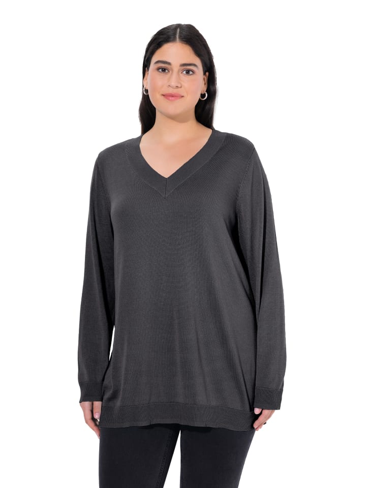 Свитер с V-образным вырезом из мягкой тонкой вязки с длинными рукавами и ребристыми манжетами.