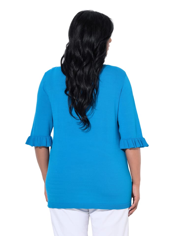 Джемпер классического кроя из мягкой смесовой вискозы тонкой вязки. V-образный вырез, длинные рукава с воланами и ребристыми манжетами. Внешний материал: 65% вискоза, 35% полиамид.