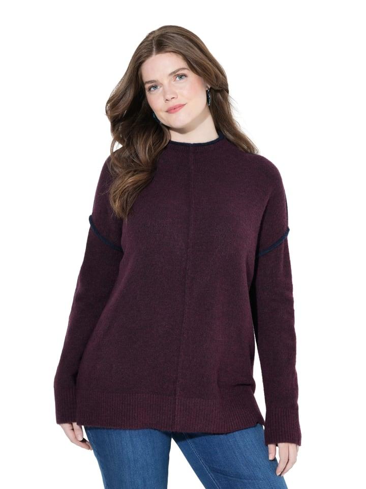 Свободный свитер из мягкой меланжевой пряжи с контрастными полосками на воротнике-стойке, спереди и сзади. Длинные рукава с ребристыми манжетами и боковыми разрезами для большего комфорта.