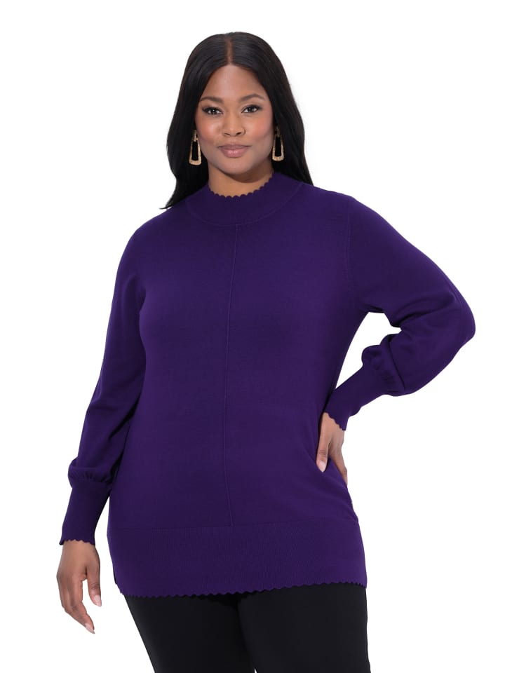 Свитер удобного классического кроя из вискозы тонкой вязки с ребристыми манжетами и фестончатыми краями на воротнике-стойке, длинных рукавах и подоле.