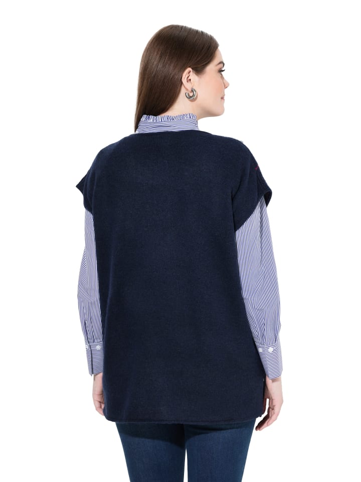 Мягкий тонкий трикотажный свитер с узором ромбы. V-образный вырез, боковые разрезы и ребристые манжеты. Без рукавов.