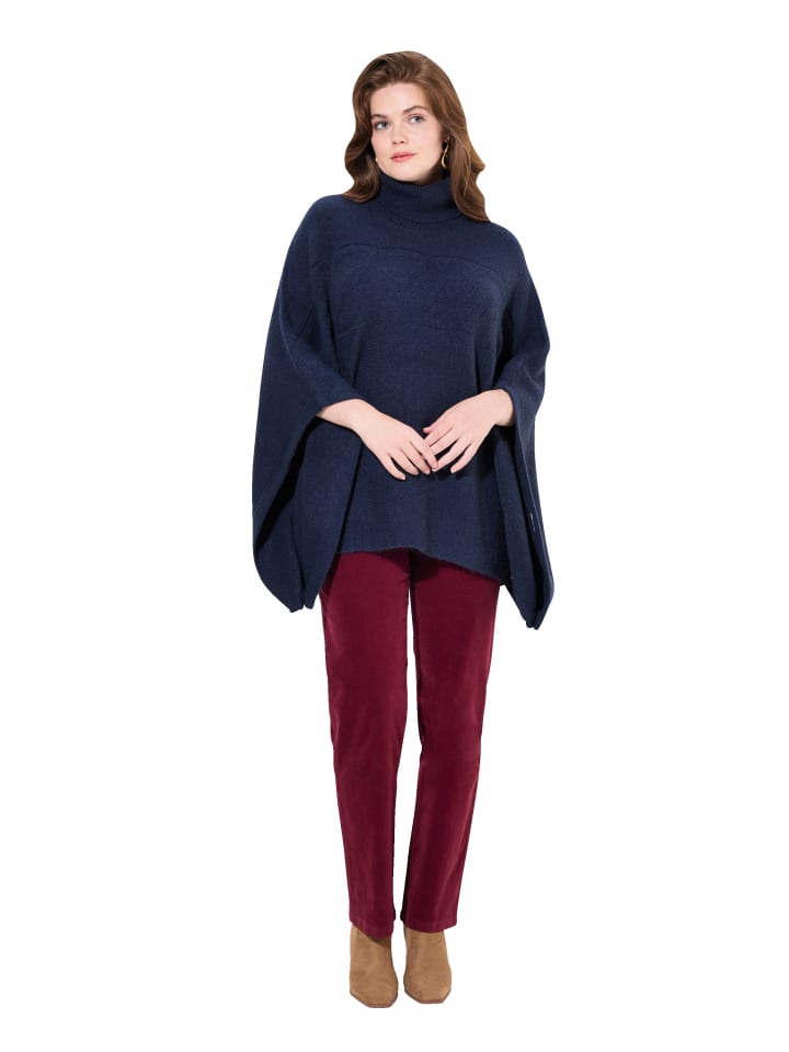 Пончо свободного покроя из мягкой тонкой пряжи с высоким воротом и широкими спущенными плечами. Короткие рукава.