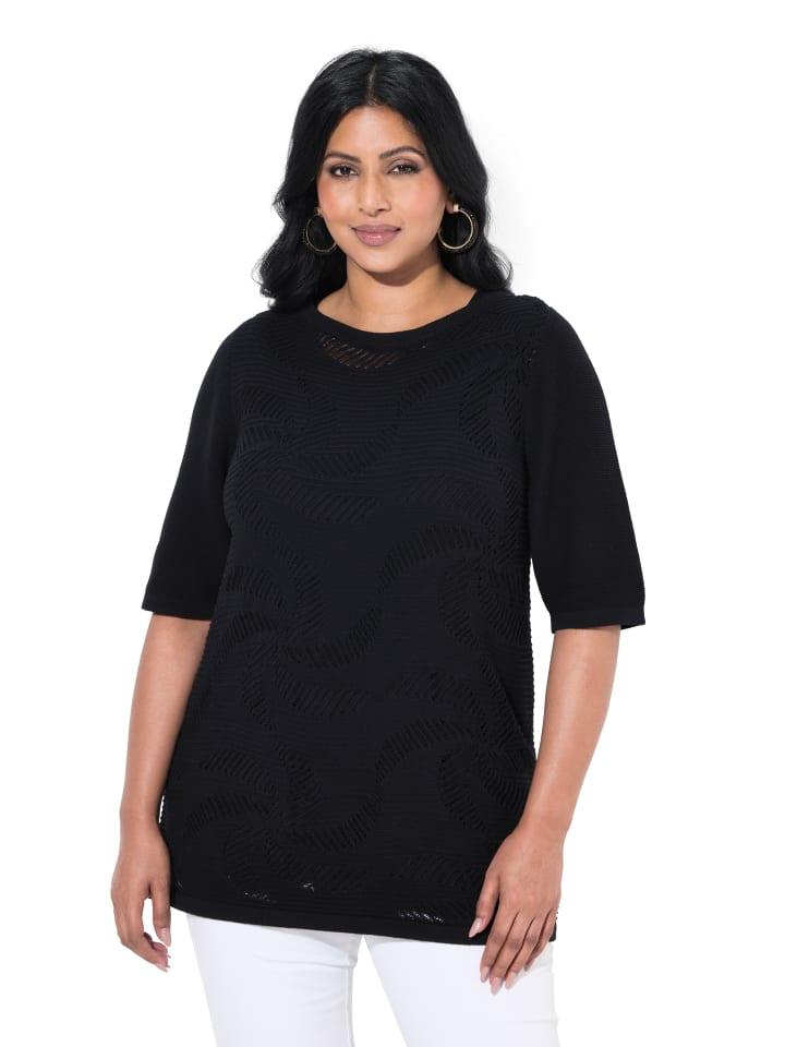 Свитер классического кроя из мягкого хлопкового трикотажа с цветочным узором и тонкой фактурой. Вырез горловины "лодочка", короткие рукава и гладкий нижний край.