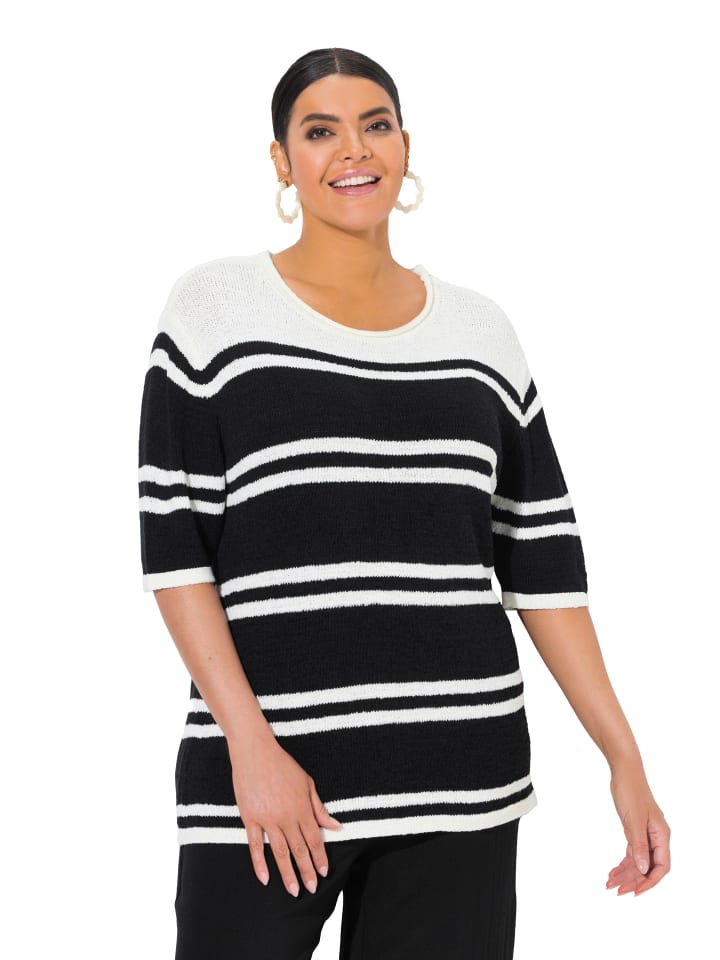 Свитер, немного укороченный, свободного кроя, из мягкой ленточной пряжи с цветными полосками и подвернутыми краями. Круглый вырез, короткие рукава.