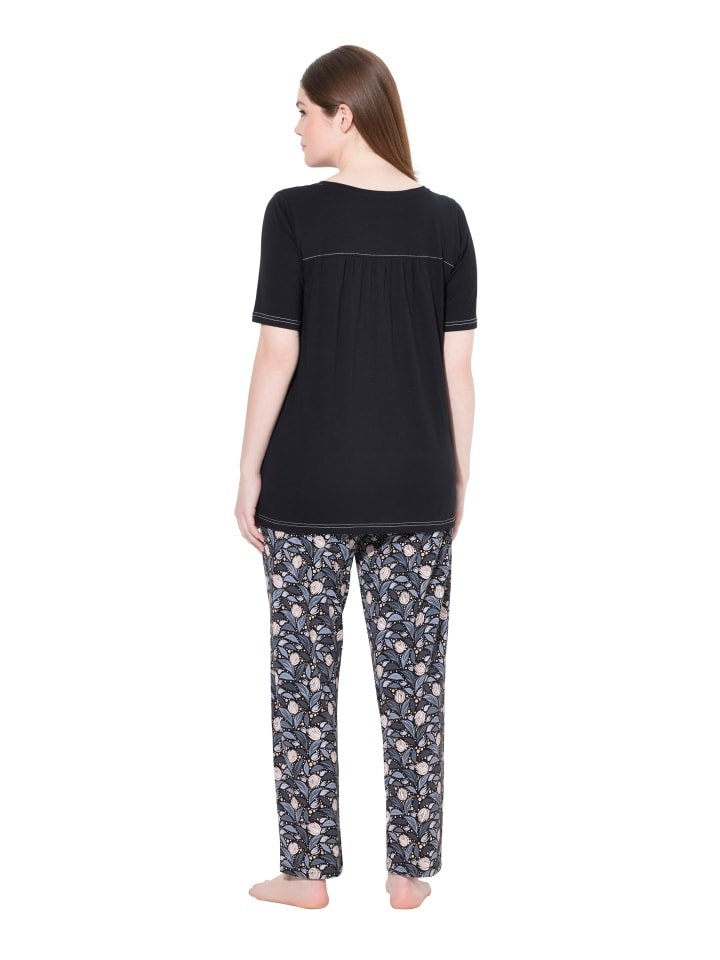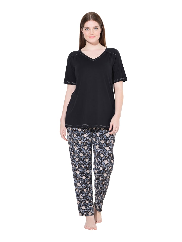 Пижамный комплект из двух частей из мягкого трикотажа. Топ с V-образным вырезом, оборками на плечах и короткими рукавами. Длинные облегающие брюки с узором из листьев, эластичным поясом и боковыми карманами. OEKO-TEX. Внешний материал: 100% хлопок.