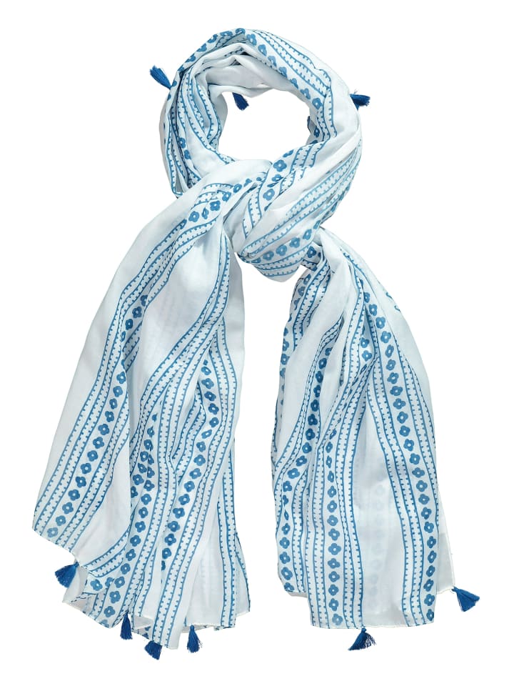 Шарф с декоративными узорчатыми полосками и кисточками.