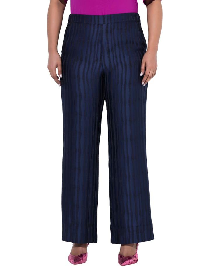 Широкие прямые брюки из современной фактурной ткани. Частично эластичный пояс, боковые карманы.